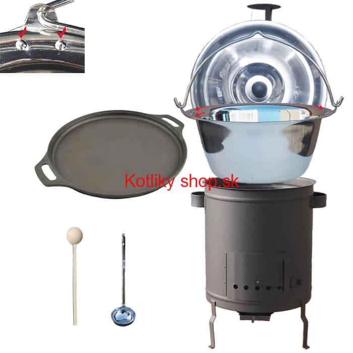 - Nerezový kotlík 20 L (0,8 mm) zosilnený s nitmi + Liatinová panvica 43 cm + hrubostenná (1,5 mm) a žiaruvzdorná kotlina 42 PLUS 600